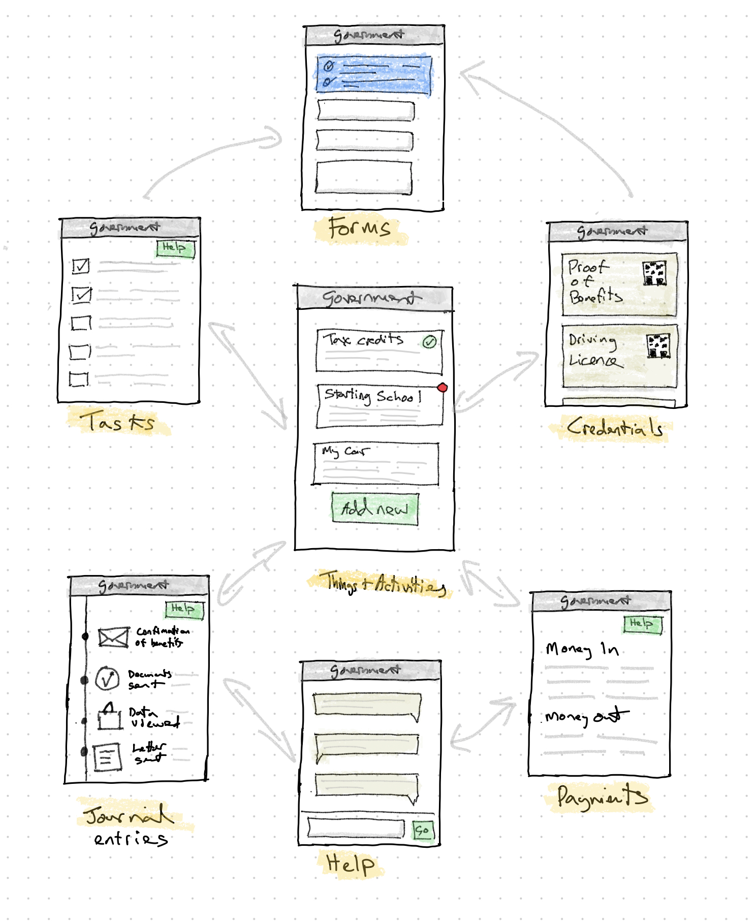 Taking inspiration from India (DigiLocker) and Australia (the single todo list for government mentioned in the recent myGov report), what would happen if we took the idea of entire government services becoming features of a cross-government digital product to the extreme? What if we could unbundle all of the common aspects of government services, regardless of which part of government operates them, into their component parts and then reassemble them as features of a single digital product. How might it feel to interact with government? Below is a thumbnail sketch.